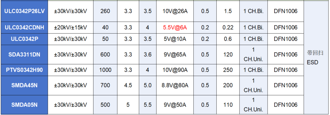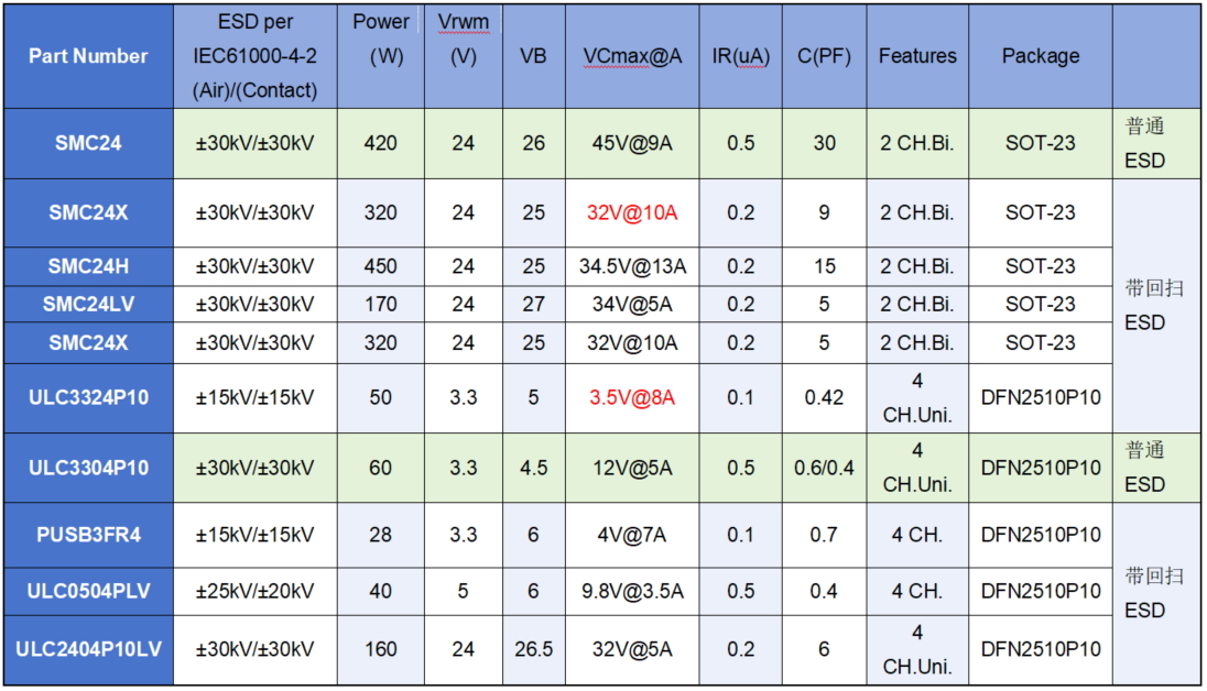 3. 多路回扫TVS/ESD与常规TVS/ESD对比列表