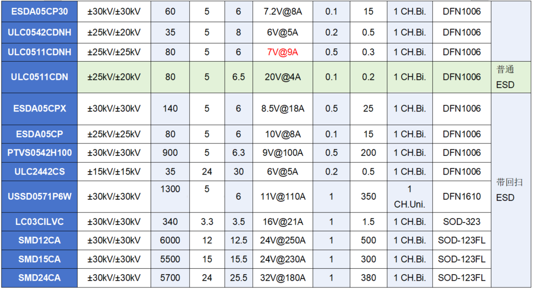 1. 单路回扫TVS/ESD与常规TVS/ESD对比列表