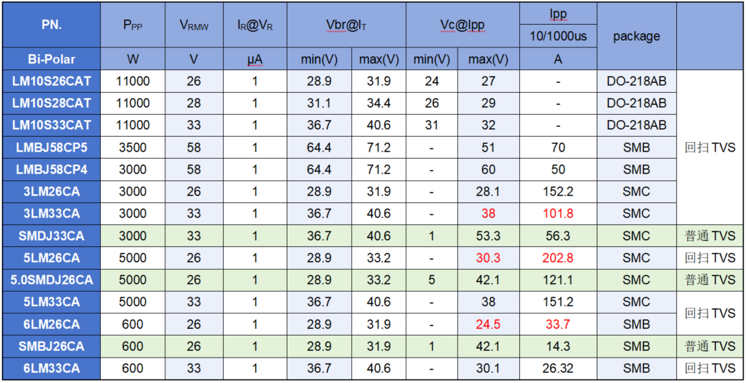 4. 带回扫大功率TVS产品列表与普通TVS对比