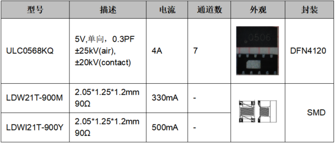 方案优点:USB3.0提供5.0Gbps的传输速度,本方案采用单颗器件防护,节约空间, 保证信号完整性,配置共模电感,可滤除共模干扰,满足IEC61000-4-2,等级4,接触放电25kV,空气放电20kV